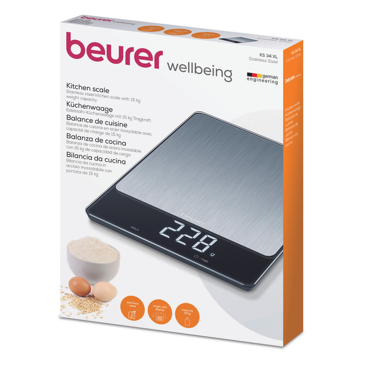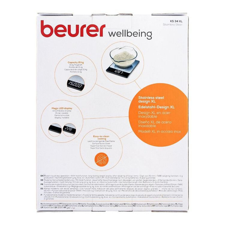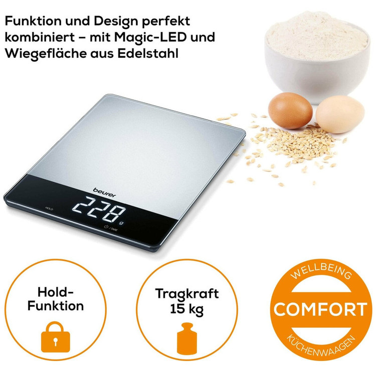 ترازوی آشپزخانه بیورر برند مطرح و قدیمی آلمانی با دقت 1 گرم و کارایی تا 15 کیلوگرم و جنس استیل خود یک وسیله فوق العاده کارآمد در هر آشپزخانه می باشد. این ترازو قابلیت حذف وزن ظرف روی خود را نیز دارد تا بتوانید اندازه گیری دقیقی از مواد خود داشته باشید. با دکمه Hold می توانید وزن مورد نظر را نگه دارید. همچنین سطح این ترازو ضد اثر انگشت می باشد و به راحتی تمیز میشود. این ترازو با 4 باتری نیم قلمی کار میکند و فقط در زمان کار صفحه نمایش آن فعال میشود.