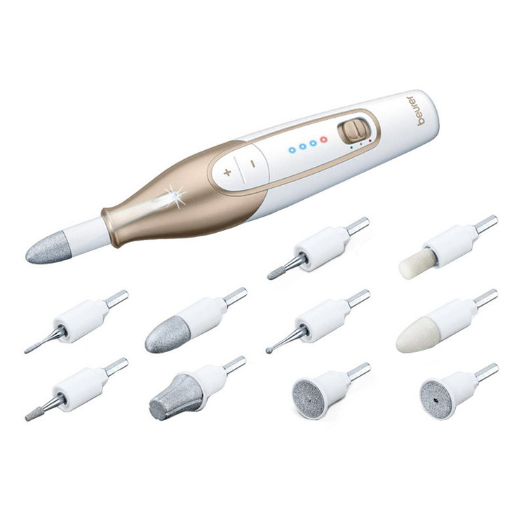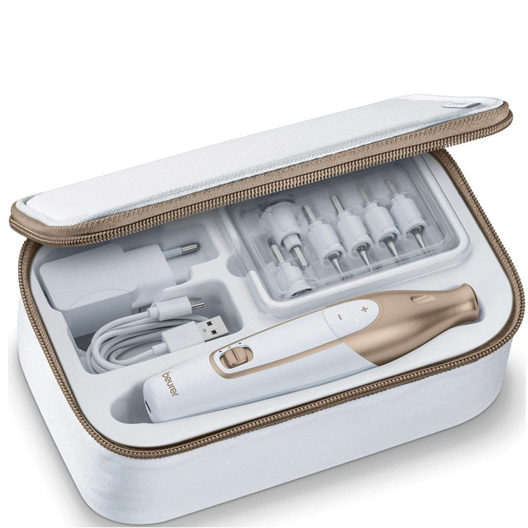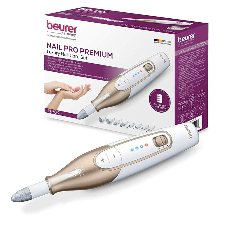 بهترین ست مانیکور و پدیکور بیورر، قطعا MP 64 است. این محصول بصورت بی سیم (Wireless) بوده و تمامی اصول طراحی و کیفیتی این کمپانی آلمانی را در بالاترین سطح رعایت کرده است. ست مانیکور و پدیکور MP 64 با استفاده از باتری قدرتمند و بادوام لیتیون یون، میتواند 2 ساعت با هر شارژ از طریق USB ، روشن بماند و برای فضاهایی که پریز برق نزدیک نیست یا نیاز به دقت بالا بدون مزاحمت سیم، وجود دارد عالی است. این محصول مجهز به 10 سری درجه یک می باشد که برای ناخن و پوست کاربرد دارد. وجود LED برای روشن کردن محدوده پاکسازی وزیباسازی نیز بسیار کاربردی است. بیورر آلمان حساسیت خاصی در مهندسی و ارگونومی دارد و بالانس و گریپ عالی MP64 برای طولانی مدت نیز مشکلی ایجاد نمی کند.در نهایت 3 سرعت قابل انتخاب ، 2 حالت چرخش (به راست یا به چپ) و یک کیف نگهداری درجه یک از مشخصات این محصول می باشد.