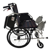 ویلچر از جنس آلومینیوم بسیار سبک وزن با چرخ های عقب 20 اینچ که هم توسط یک نفر دیگر غیر از بیمار هدایت میشود و هم توسط خود کاربر دسته های پشتی ویلچر به صورت شکن. دسته های کناری متحرک هستند و کاربر میتواند با بالا بردن دسته های کناری راحت روی ویلچر بنشیند. ترمز روی چرخ ها و دسته های ترمز هم روی چرخ و هم روی دستگیره های ویلچر (دارای قفل) میباشد.دارای کیف در قسمت پشتی ویلچر. دارای جاپایی های متحرک.