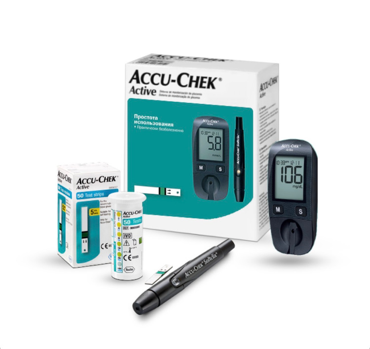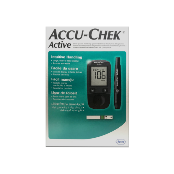 دستگاه اندازه گیری قند خون خانگی اکتیو (accu chek active) با حداقل خون مورد نیاز، دارای دقت بالا و قابلیت میانگینگیری از نتایج 7، 14، 30 و 90 روز بوده و منبع تغذیه آن باتری سکه ای CR2032 می باشد.