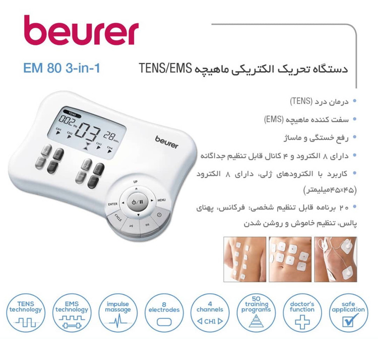 شرکت بيورر از جمله کمپانيهايي است که براي رفع اين تنس ها دستگاههايي چون EM80 را طراحي کرده که اين دستگاه از طريق الکترودهايي که به نقاط مدنظر متصل شده باعث گردش خون و رفع گرفتگي و حتي ماساژ ميشود.