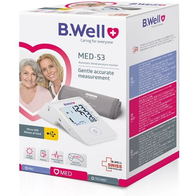 دستگاه فشارسنج بازویی بی ول مدل MED-53 یکی از فشارسنجهای باکیفیت دیجیتالی موجود در بازار است که دور بازو بسته میشود و فشار خون فرد را آسان و دقیق اندازهگیری میکند. تمام اطلاعاتی که کاربر نیاز دارد بر روی LCD آن نمایش داده میشود. برای مثال در صورت ضعیف شدن باتری دستگاه نشانگر باتری ضعیف روی صفحه ظاهر میشود تا از خطای محاسباتی دستگاه جلوگیری به عمل آید. این محصول قابلیت ثبت و نگهداری اطلاعات مربوط به نود اندازهگیری اخیر انجام شده با دستگاه را دارد. از آنجایی که این فشارسنج نشانگر تاریخ و زمان دارد به همین خاطر امکان کنترل فشارخون بیمار بعد از هر چند بار اندازهگیری را برای کاربر فراهم میکند. همچنین شما میتوانید نتایج ثبت شده در حافظهی دستگاه را با پزشک خود در میان بگذارید تا بررسی وضعیت بیماری شما به شکل دقیقتری انجام پذیرد. فشار سنج بازویی بی ول با باتری نیمقلم و یا توسط آداپتور برق شارژ میشود. از این محصول میتوان به آسانی و بدون کمک دیگران استفاده کرد. کاربری و روش استفاده از این دستگاه بسیار آسان است و با بستن آن به دور بازو در کمترین زمان ممکن فشارخون شما سنجیده میشود. در انتها در نظر داشته باشید که دستگاههای فشارسنج بازویی نسبت به دیگر مدلهای دیجیتال، دقت اندازهگیری بالاتری دارند.