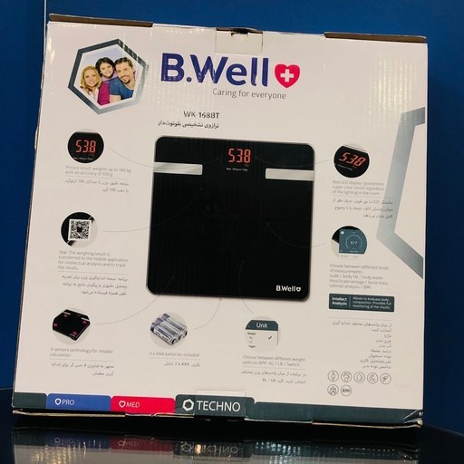 رازو دیجیتالی تشخیصی بی ول WK-168BT محصول کشور سوییس می باشد. این ترازو با طراحی بسیار منحصر به فرد و مدرن یک ترازوی تشخیصی با دقت اندازه گیری بسیار بالا می باشد و دارای حسگرهای کرنش سنج با ظرفیت بالا است که دقت این محصول را بالا می برد. ترازو تشخیصی بلوتوث دار بی ول WK-168BT محصول کشور سوییس می باشد. این ترازو با طراحی بسیار منحصر به فرد و مدرن یک ترازوی تشخیصی با دقت اندازه گیری بسیار بالا می باشد و دارای حسگرهای کرنش سنج با ظرفیت بالا است که دقت این محصول را بالا می برد. این محصول دارای نمایشگر باتری ضعیف است که در صورت اتمام باتری علامت اخطار بر روی مانیتور ظاهر می شود. یکی دیگر از ویژگی های این ترازو قابلیت صفرشدن و خاموشی خودکار می باشد که راحتی استفاده را برای مصرف کنندگان فراهم می کند. یکی از ویژگی های بارز اهمیت این ترازو قابلیت اتصال به تلفن همراه از طریق بلوتوث می باشد. که با این امکان کاربر می تواند وزن خود را تحلیل کند. لوازم جانبی ترازو تشخیصی بلوتوث دار بی ول WK-168BT: دفترچه ی راهنمای فارسی 3 عدد باتری نیم قلمی 1.5 ولتی (گنجانده شده در ترازو تشخیصی بلوتوث دار بی ول WK-168BT)